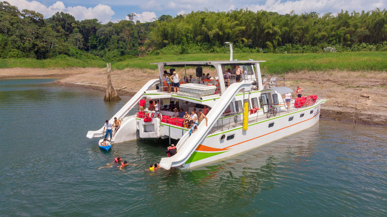Para quienes buscan una experiencia más relajada, los paseos en catamarán son una excelente opción. Con Tucán Arenal, podrás recorrer el lago mientras visita los puntos más destacados de la zona. El viaje en el catamarán incluye diversas actividades para relajarte o divertirte. Este recorrido incluye acceso a un tobogán a bordo, la posibilidad de hacer clavados desde el catamarán, el alquiler de kayaks, y otros servicios ideales para disfrutar en familia.